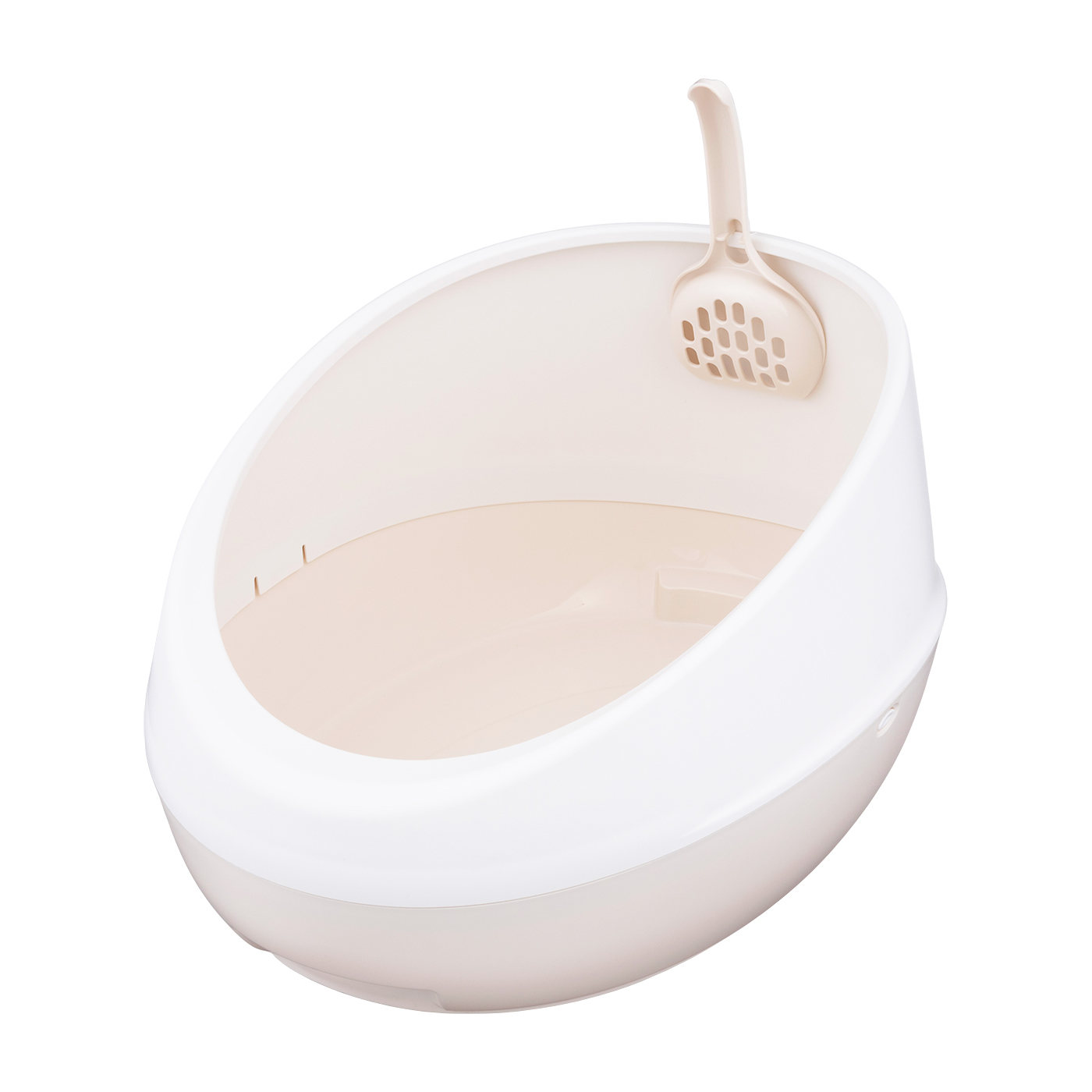「ラプレ ネコトイレ ハーフカバー」は、リッチェルが提供する猫用ノーマルトイレです。本体重量0.80kgの軽量設計で、シンプルな丸みを帯びた形状が特徴です。洗うパーツも2個と少ないうえ、底面に凹凸がなく角も丸いため、汚れがたまりにくい構造です。スコップ付きで本体に掛けられるため、収納にも便利でしょう。