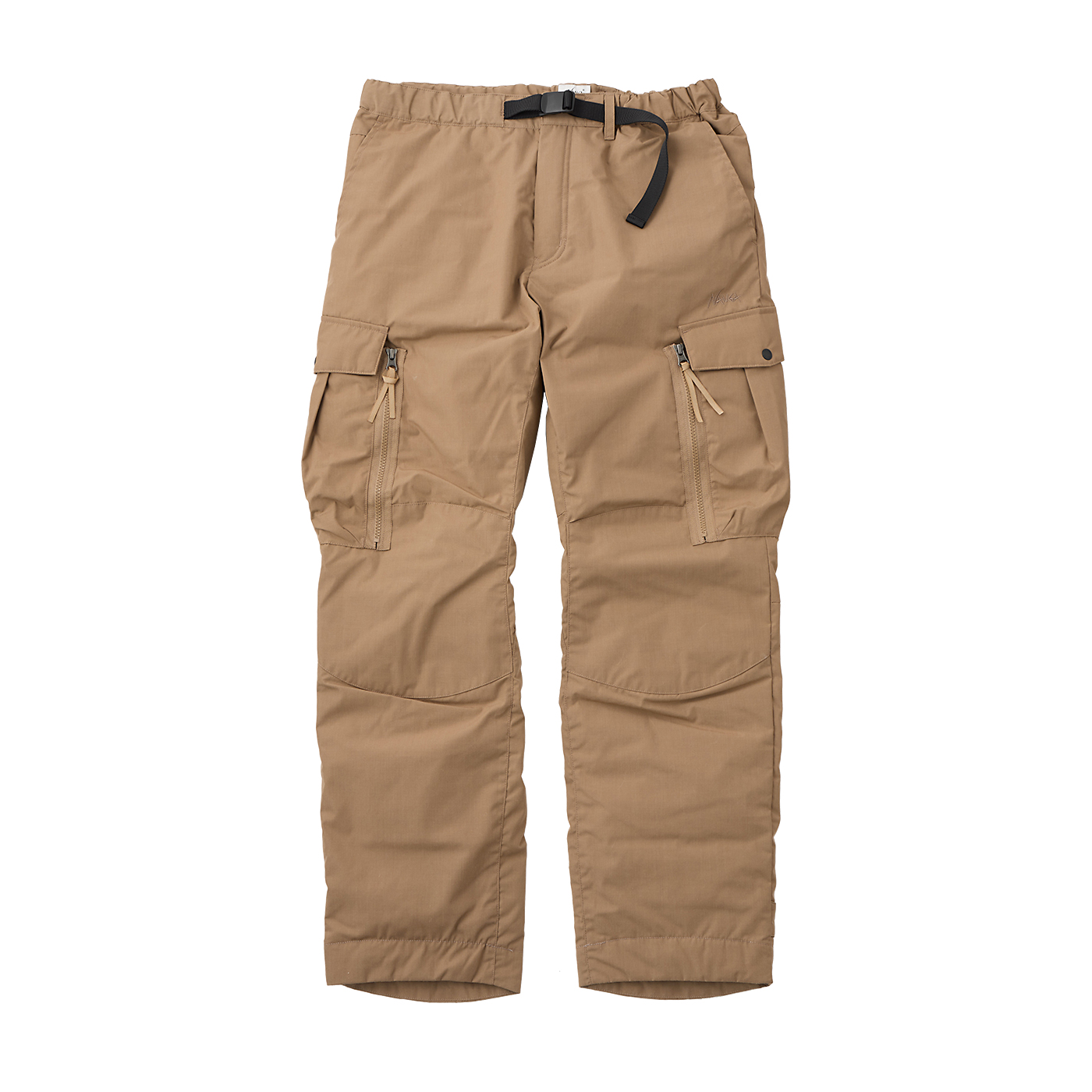ナンガ(NANGA)は、高品質なダウン製品で高い人気を誇る日本のブランド。同社の「TAKIBI DOWN PANTS(焚き火ダウンパンツ)」は、その名の通り焚き火での使用を考えて作られた、難燃素材を使ったダウンパンツです。フェザー10%を含んだ状態で実測FP 733と、検証したなかで圧倒的なFPの高さを記録。封入されている綿の量も実測で約272gと、2位以下に2倍以上の差をつける結果でした。強風が吹きつける1月のキャンプで使用しましたが、足元は冷気を一切感じず、寝袋が無くても寝られそうと思うほど。封入されたダウンを手に取った感触でも、圧倒的な軽さとふくらみでした。難燃素材である「タキビ素材」を使用し、焚き火の近くで使える点も魅力。火の粉が飛んで穴が空かないか、心配しながら使う必要はありません。痛みやすい膝に補強が施されているため、キャンプで地面に膝をついたときも破れにくいでしょう。撥水加工も非常に強力で、検証ではかけた水が水滴となってポロポロと落ちていきました。またダウン自体にも撥水加工が施されているため、もし内部に水分が入っても保温性を損ないにくい点も魅力といえます。大きなポケットもキャンプで使いやすく、スマホとモバイルバッテリーを一緒に入れて充電しながら使ったり、グローブ・ナイフ・ライトなどを持ち歩いたりする際も重宝しました。持ち運びにくいため登山には向きませんが、キャンプ用の防寒着や街着として使いたい人におすすめ。キャンプで使うならこれ以上ないと思えるほど、軽く・暖かく・丈夫なダウンパンツです。