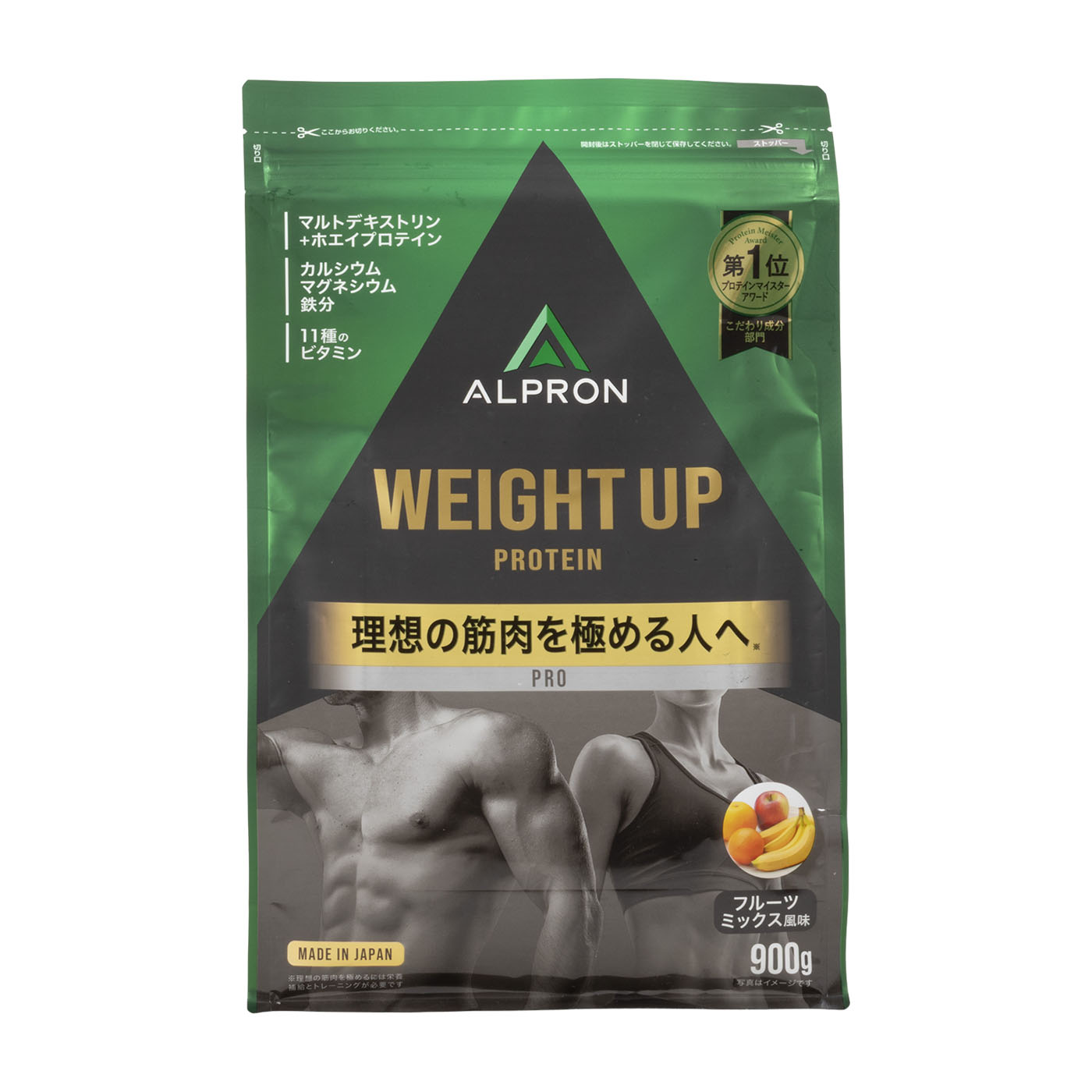 アルプロンの「ALPRONウェイトアップ フルーツミックス風味」は、ホエイを主要成分としたウエイトゲイナーです。容量は、900g入りで約30回分。アンチドーピング認証を取得しており、日本で製造されています。成分分析の結果は、おおむね良好でした。1杯あたりたんぱく質は6.1gで炭水化物は21.3gと理想的なバランス。総量100gから摂れるカロリーは86.2kcalと低く、増量には不向きではあるものの、脂質はほぼ含まれていないため、脂質過多になりにくい商品といえます。糖質の補給に適したマルトデキストリンやミネラル・11種類のビタミンが配合されている点は魅力のひとつです。おいしさの評価も、良好な結果でした。粉っぽさやダマは気にならないと好印象。モニターからは「適量な甘さでケミカル感も穏やかにまとまっていた」という声があがった一方で、「人工甘味料の甘さや酸味を強く感じた」との声もありました。人工甘味料が気ならない人であればおすすめできる商品といえるでしょう。溶けやすさの検証では、高評価を獲得しました。数回シェイクするだけでダマが一切残らず、非常に溶けやすいため、手間を省き、無理なくリピートし続けたい実用性重視の人におすすめできる商品です。