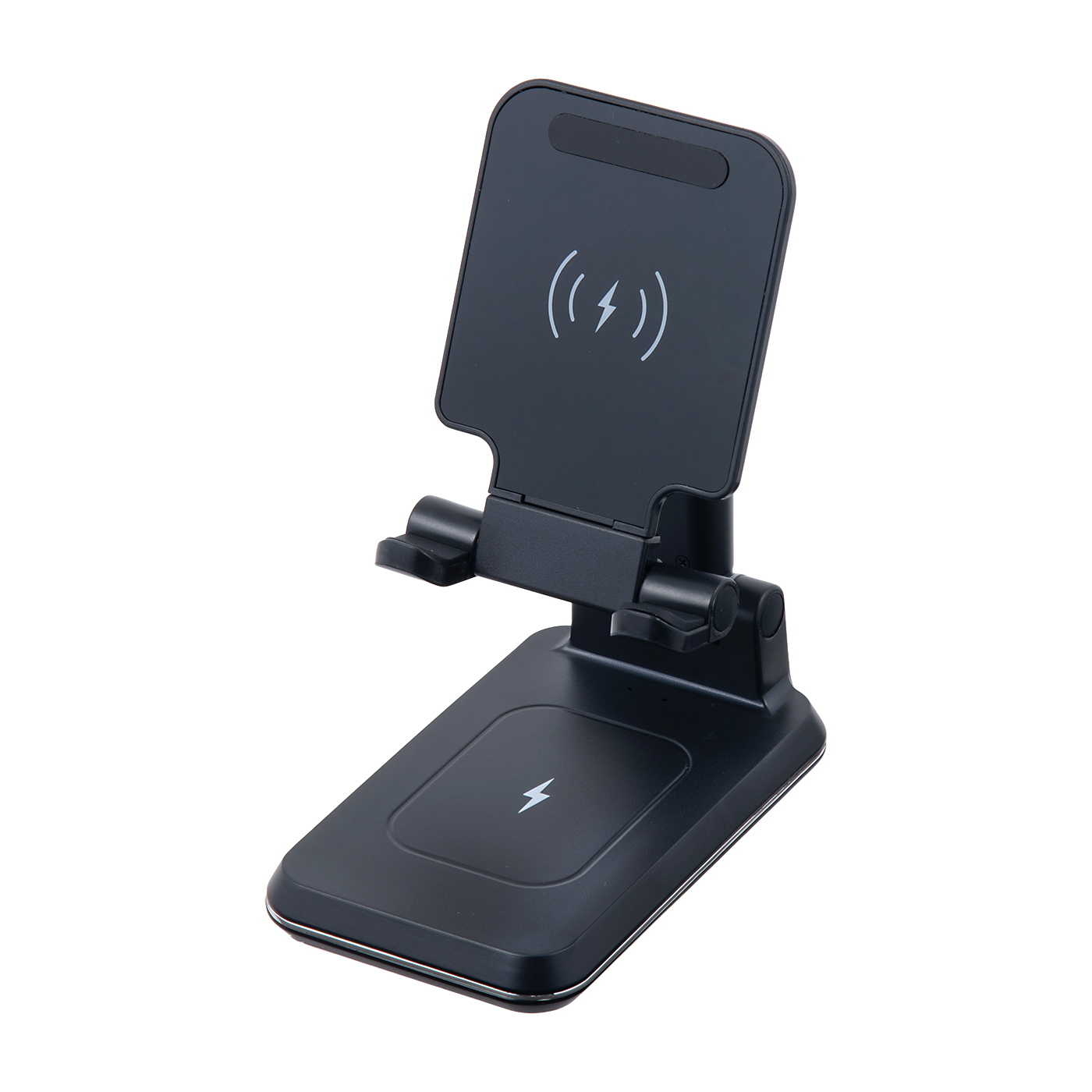 スタンドの角度調整が可能。イヤホンも同時充電できる