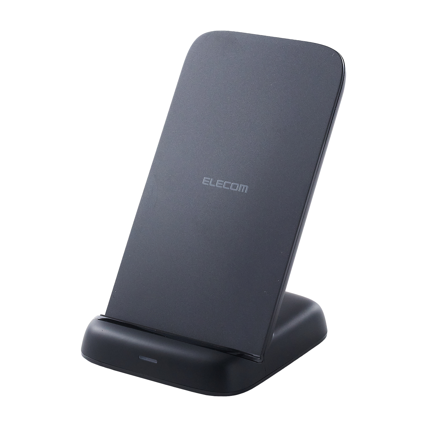 さまざまなデジタル機器の販売を行っているメーカー、エレコムの「W-QS08シリーズ」。カラーはブラック・ホワイトの2色展開で、USB Type-C to Type-Cケーブルが付属しています。スタンドタイプの充電器でスマホを置く際は上下の位置を気にせず充電可能です。左右の調整はスマホの縦置き・横置きのどちらも中心から10mmまでズレても充電できました。充電範囲が広く意識せずにスマホを置いてもしっかりと充電できるでしょう。厚さが約2mmの薄いクリアケースと約4mmの手帳型ケースでも充電が可能。一方、同じ厚さでもフレームが太いiFaceでは充電ができませんでした。背面が分厚めケースでも充電は可能ですが、フレームの太さによっては充電できない場合があります。公称値の最大出力は10W。Xperia 1 Vを30分間充電したところ20%の充電が溜まりました。充電は速く、朝の時間がないときでも十分な充電が溜まるでしょう。LEDが正面に配置されていて、いつでも充電状況を確認でき、スタンド下部には滑り止めがついているので安定してスマホの充電が可能です。入力ポートはType-Cでコンセント以外からも給電ができます。