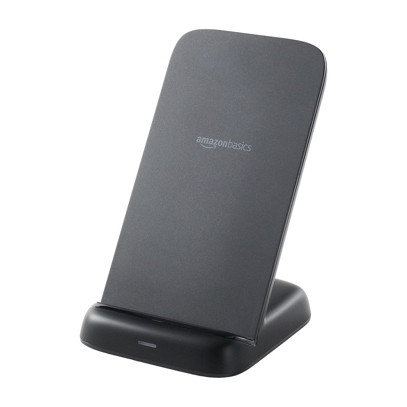 大手ECサイトAmazonのプライベートブランド、Amazon Basicsの「ワイヤレス充電スタンド」。カラーはブラックのみで、USB Type-A to Type-Cケーブルが付属しています。形は上下方向の位置合わせが必要ないスタンドタイプ。左右の位置合わせはスマホの縦置きで5mm、横置きで10mmのズレまで充電できました。横置きの充電範囲が広いので、スマホを横向きに立てかけて充電しながら動画を視聴できます。厚さが約2mmのAppleの純正ケースや少し厚めのTPUケースであれば充電可能。一方で、iFaceや手帳型ケースなどの厚さが約4mmでしっかりと厚さのあるケースでは充電できませんでした。厚めのケースを使っている人は充電のたびにケースを外す必要があり、やや手間を感じるでしょう。公称値の最大出力は10W。Xperia 1 Vを使用した充電の速さの検証では30分間で19%の充電を記録しました。充電は十分高速なので、スマホの充電が遅いと感じることはほとんどないでしょう。LEDは確認しやすい正面に配置されており、スタンド部分には滑り止めを搭載。入力端子もType-Cポートで使いやすい充電器です。