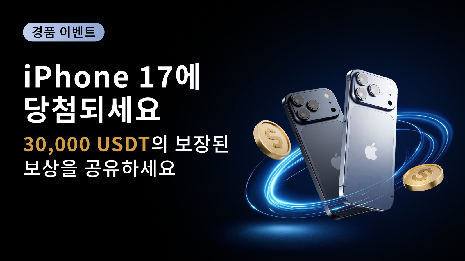 • 100% 행운 추첨 보상은 이벤트 종료 후 10영업일 이내에 지급됩니다. 본 이벤트에서 iPhone 17 상품은 1대로 한정이며, 약 1,500 USDT 상당의 환산된 USDT로 지급됩니다. 토큰 보상은 사용자의 현물 지갑으로 에어드랍되며, 체험금은 선물 지갑에 지급됩니다.
