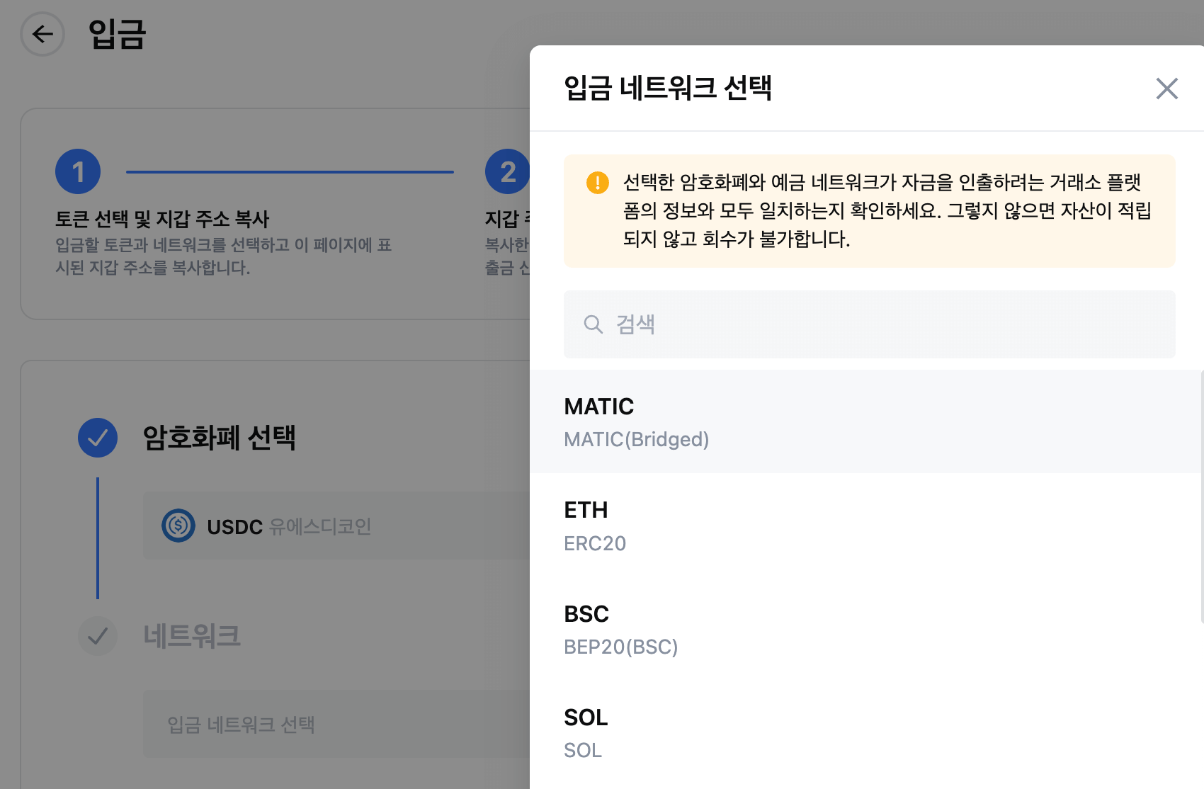 • 입출금 페이지에서 Polygon 네트워크에 있는 네이티브 USD Coin (USDC)의 네트워크 이름은 MATIC으로 표시됩니다. 자산 손실을 방지하기 위해 입금/출금 진행 전에 확인하시기 바랍니다.