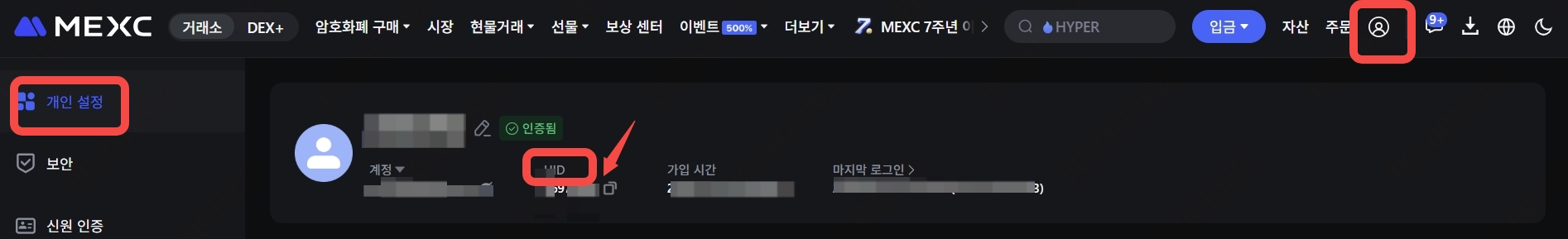 - MEXC 계정에 로그인한 후 [프로필]로 이동하여 UID를 복사합니다: