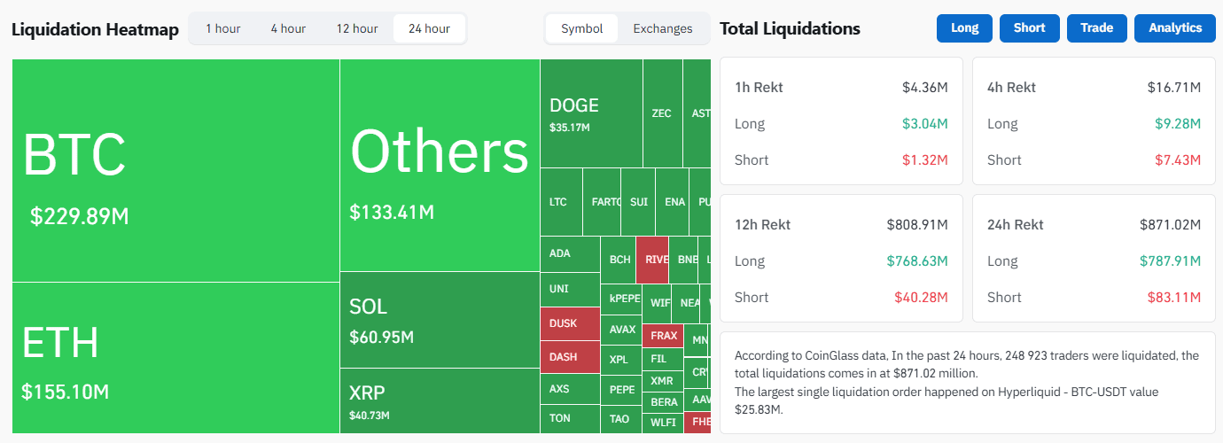 Over the past 24 hours, the volume of liquidations on crypto asset futures contracts totaled $871 million, according to CoinGlass. The wave of forced position closures was triggered by volatility, the reason for which, according to experts, is the tariff policy of US President Donald Trump’s administration.