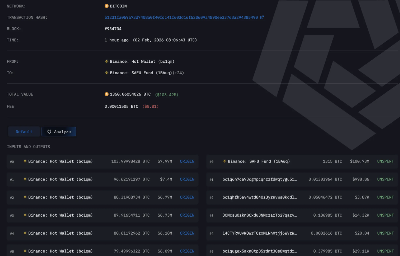 Binance has taken the first concrete step in its plan to restructure the Secure Asset Fund for Users (SAFU), transferring 1,315 Bitcoin tokens (BTC), worth approximately $100.7 million, into the fund on February 2, 2026, according to on-chain data.