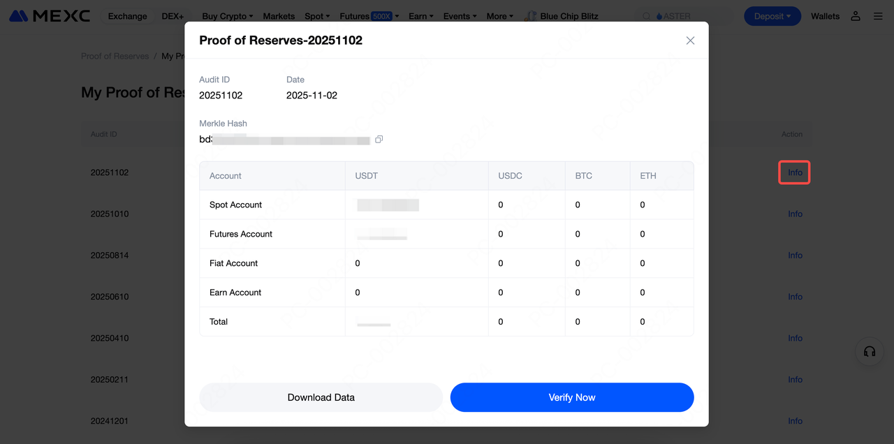 MEXC позволяет пользователям самостоятельно проверить, был ли их личный аккаунт включен в последний аудит подтверждения резервов (PoR). Пользователи могут проверить действительность своего аккаунта двумя доступными способами: