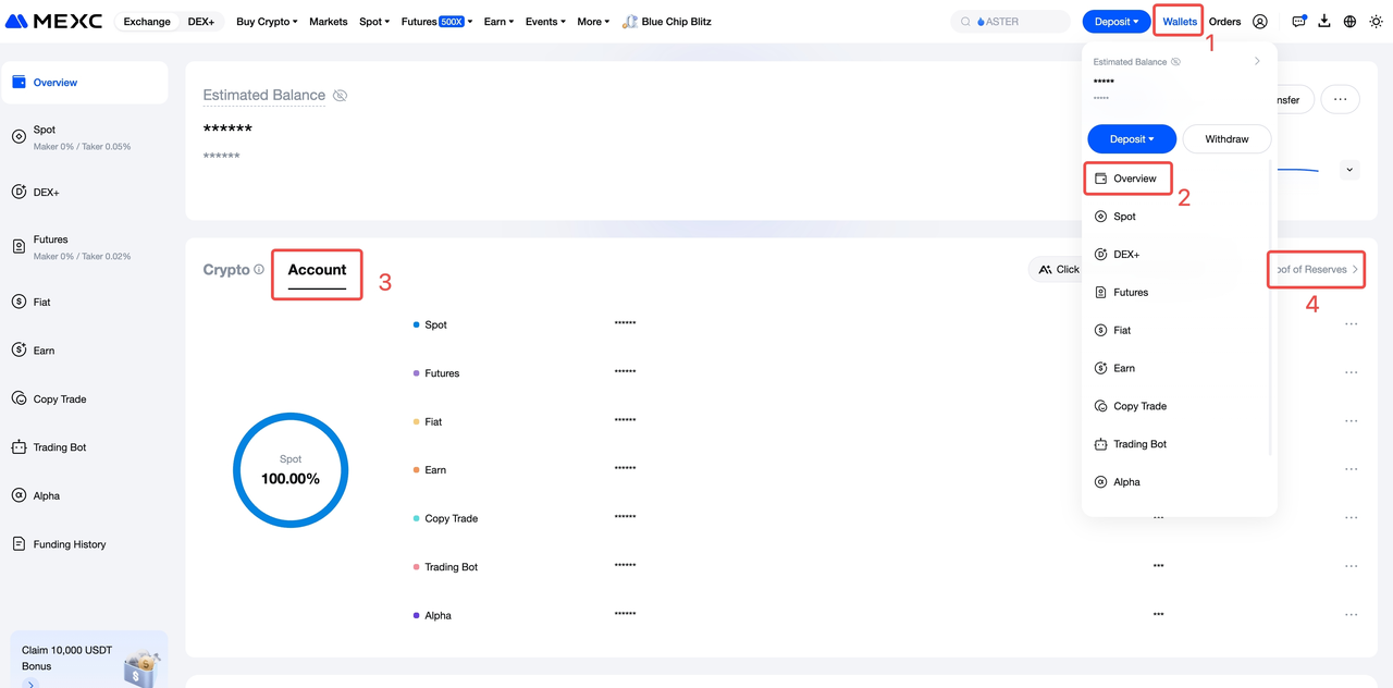 Войдите на официальный сайт MEXC. В правом верхнем углу главной страницы перейдите в раздел «Кошелек», затем нажмите «Обзор активов». На странице «Обзор активов» прокрутите вниз, чтобы найти раздел «Подтверждение резервов (PoR)».