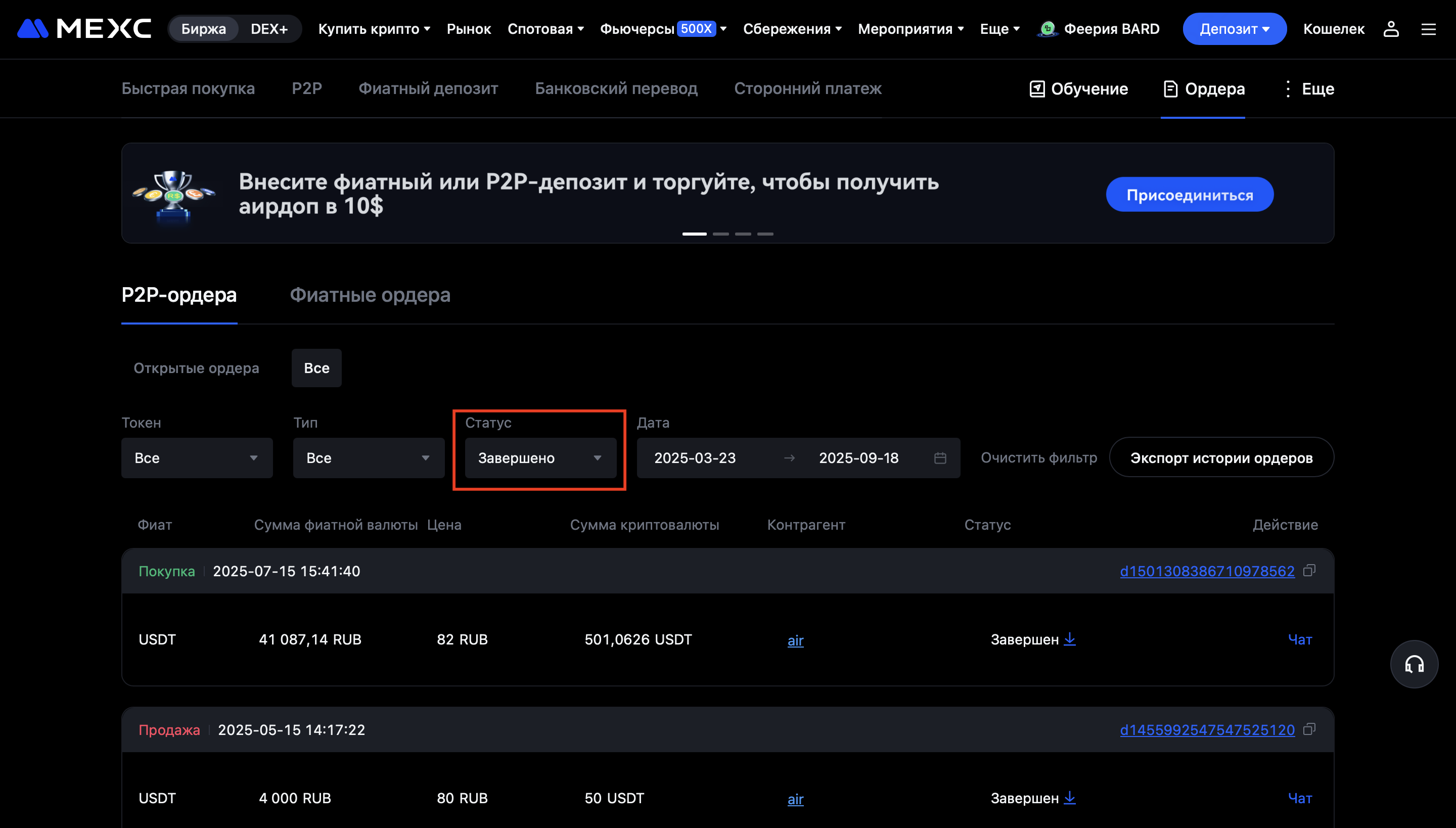 4. Нажмите на выпадающий список «Статус» и выберите «Завершено», чтобы отображались только завершенные сделки. Вы также можете фильтровать по дате, криптовалюте или контрагенту, чтобы быстрее найти конкретную транзакцию.