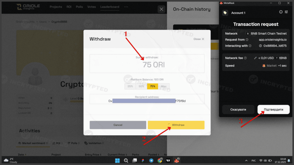 6. В разделе Balance history отслеживаем транзакции, после подтверждения баланс на платформе обновится. Также отправляем ORI напрямую между кошельками через MetaMask, чтобы протестировать переводы между пользователями: