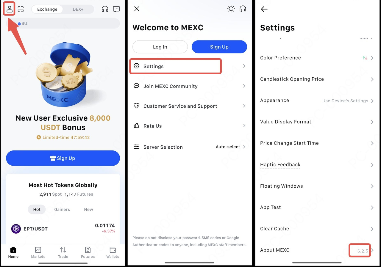 Если вы столкнулись с этой проблемой, откройте оба приложения MEXC на главном экране по очереди, нажмите на значок пользователя, перейдите в раздел «Настройки», прокрутите страницу вниз и нажмите «О нас», чтобы проверить номер версии, как показано на изображении ниже. Сохраните приложение MEXC с более высоким номером версии и удалите приложение с более низким номером версии.