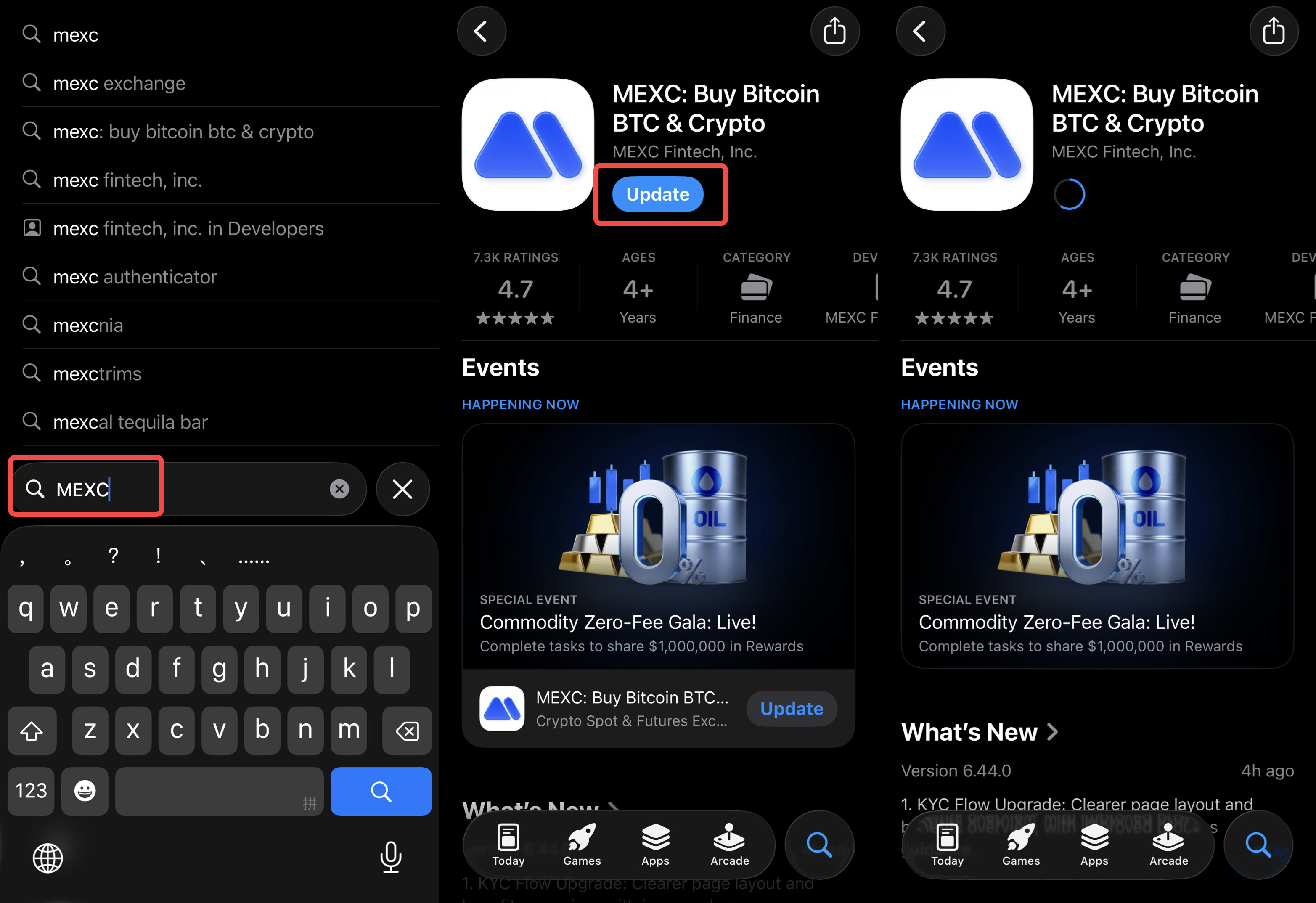 iOS: Откройте App Store и введите MEXC в строке поиска, чтобы перейти на страницу с подробной информацией о приложении. Если отображается кнопка «Обновить», нажмите ее, чтобы завершить обновление.