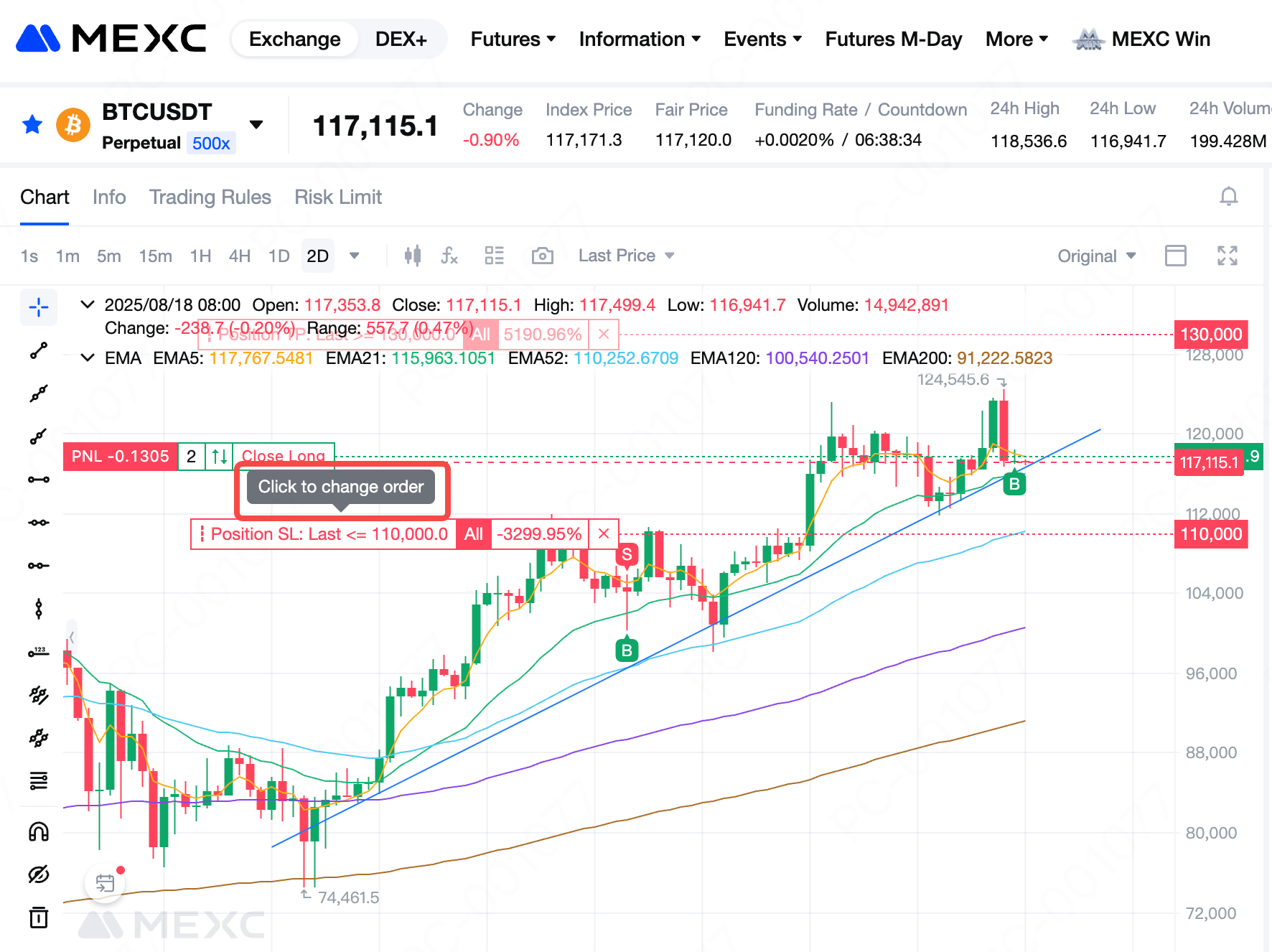 Sau khi cài đặt lệnh TP/SL, các biểu tượng tương ứng sẽ hiển thị trên biểu đồ nến tại mức giá đã chọn. Di chuột vào biểu tượng TP/SL, bạn sẽ thấy dòng Nhấn để thay đổi lệnh. Nhấn vào để mở cửa sổ Cài đặt TP/SL giá thị trường, tại đây bạn có thể chỉnh sửa mức giá TP/SL. Nhấn Xác nhận để lưu thay đổi.
