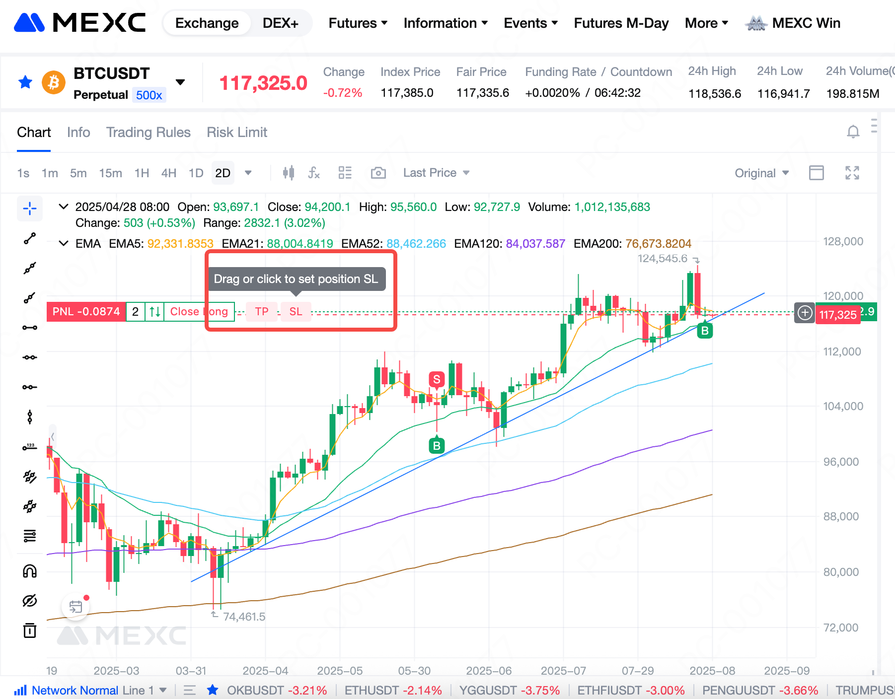 Nhấn giữ nút TP và kéo xuống. Khi kéo, bạn sẽ thấy lợi nhuận cập nhật theo thời gian thực ở bên phải. Thả chuột tại mức giá TP mong muốn, một cửa sổ Cài đặt TP/SL giá thị trường sẽ hiện lên. Nhấn Xác nhận để hoàn tất cài đặt. Cách làm tương tự với SL.