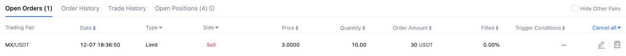 Giả sử bạn hiện có 10 MX trong tài khoản. Giá thị trường hiện tại của 1 MX là 2.94 USDT và bạn dự định bán 10 MX với giá 3 USDT mỗi token.