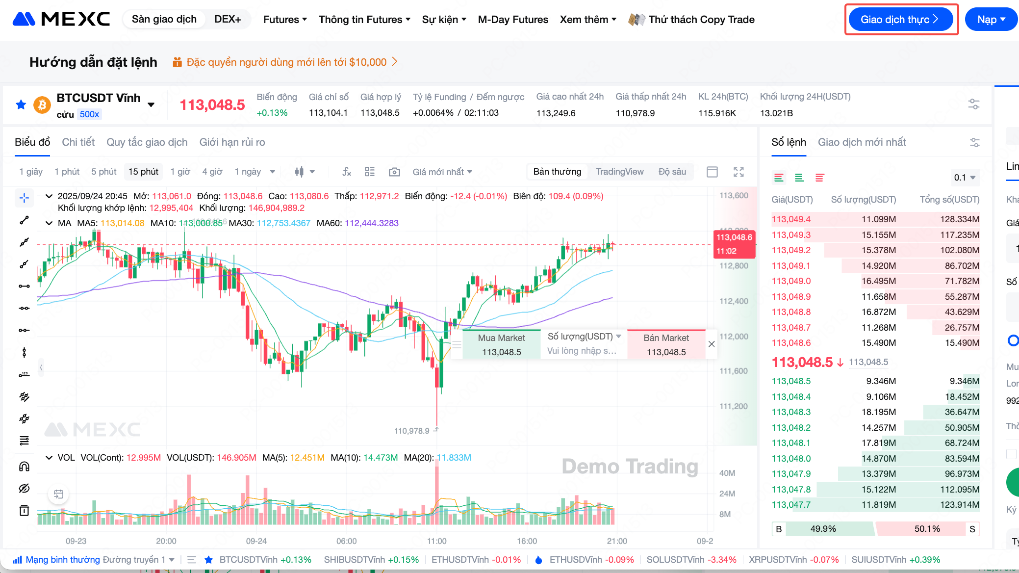 1) Giá trị của mô phỏng thực tế: Giao dịch Demo MEXC Futures mô phỏng đầy đủ giao diện, chức năng và dữ liệu thị trường giao dịch thực, bao gồm các cặp chính như BTCUSDT. Điều này hỗ trợ người dùng thực hành trong một môi trường gần giống với thị trường thực, đảm bảo việc chuyển đổi kỹ năng sang giao dịch thực tế diễn ra liền mạch.