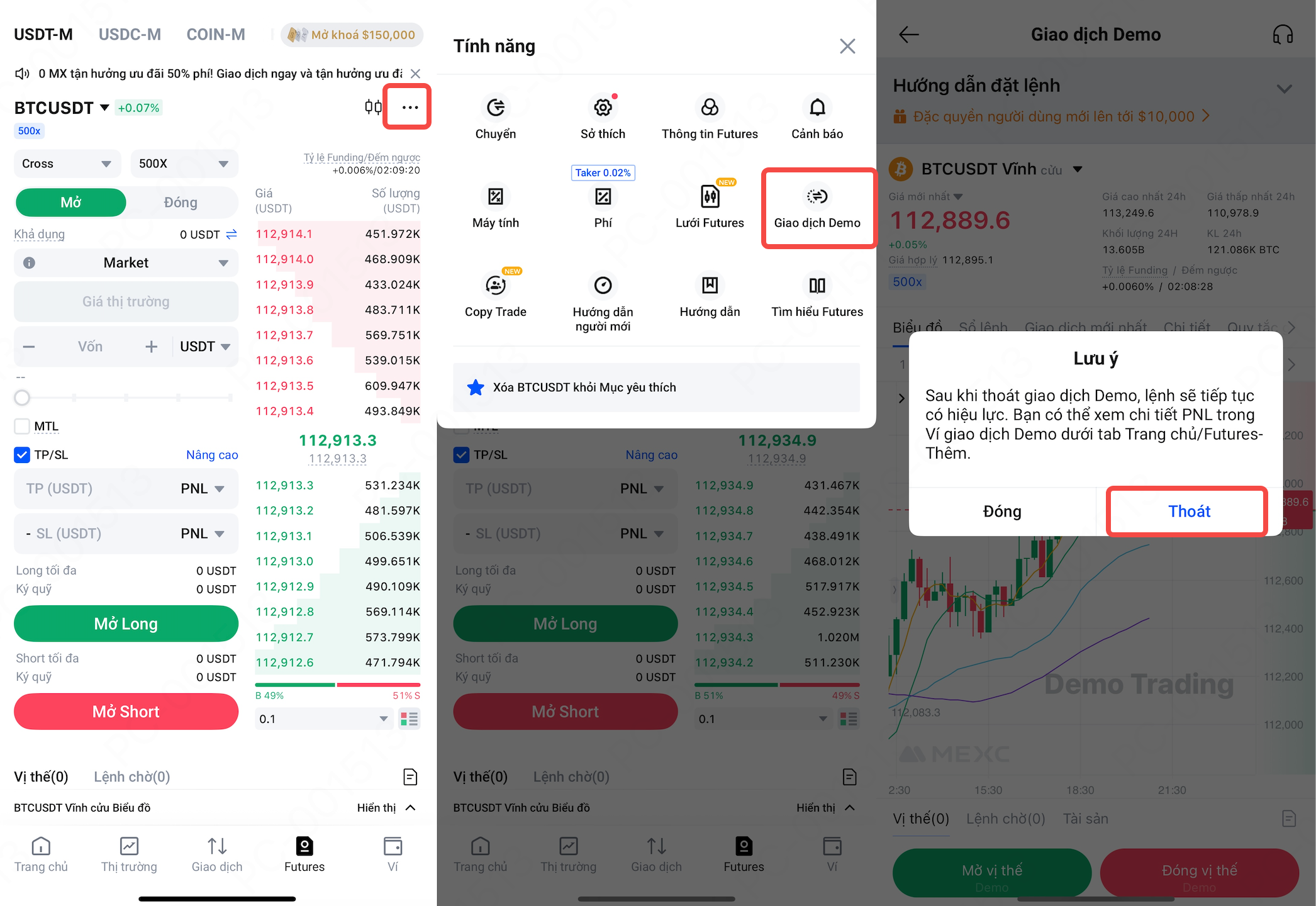 Mở App MEXC và nhấn Futures ở phía dưới để vào giao diện giao dịch thực. Nhấn ở góc trên bên phải để truy cập tính năng Giao dịch Demo. Nếu muốn thoát khỏi Giao dịch Demo, nhấn ở góc trên bên trái màn hình Giao dịch Demo và chọn Thoát để quay lại thị trường thực.