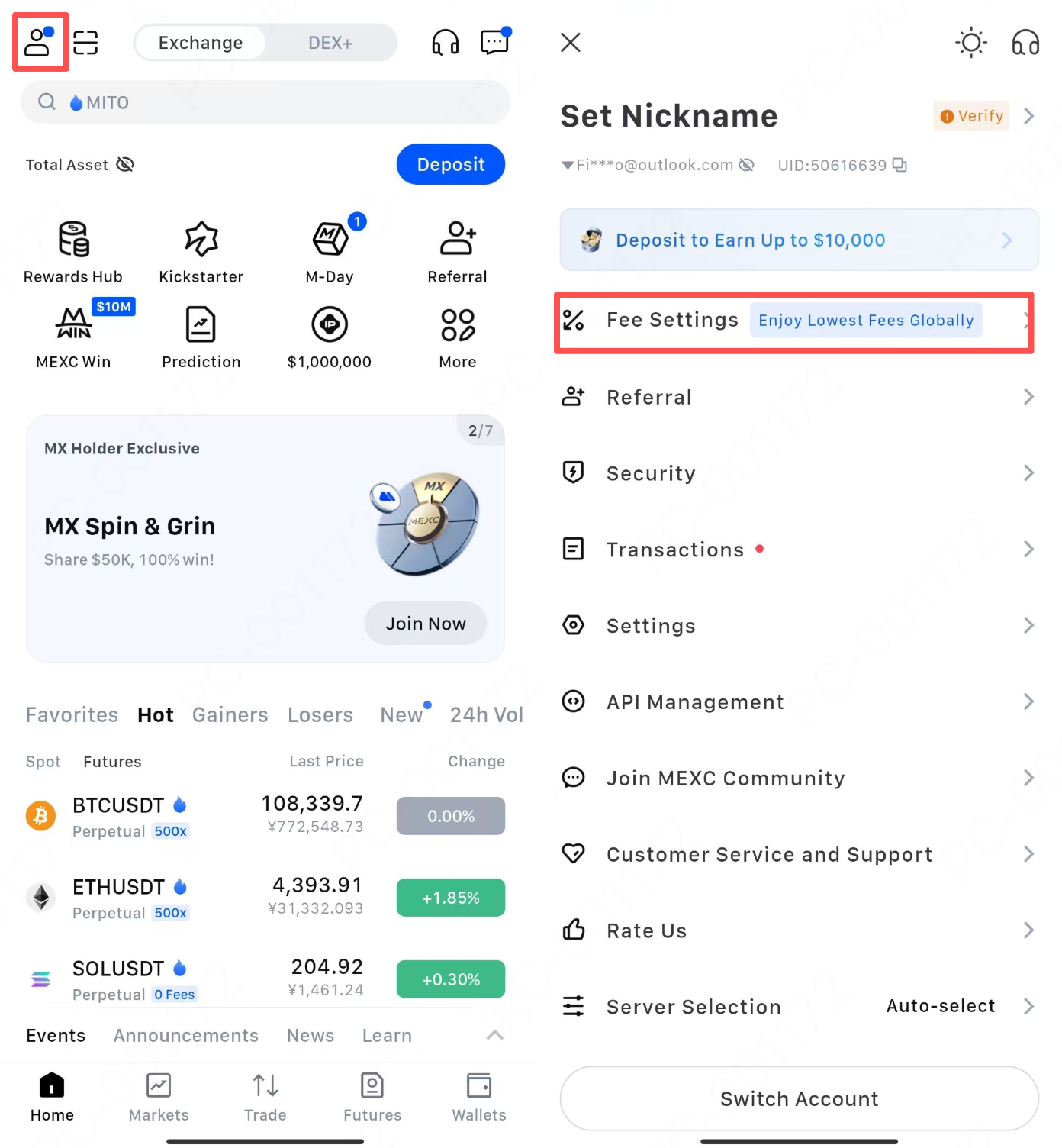 Mở App MEXC, nhấn vào biểu tượng người dùng, sau đó vào Cài đặt phí để xem thông tin phí liên quan.