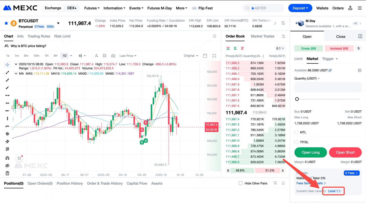 Ngoài ra, một số cặp giao dịch Futures Vĩnh cửu trên MEXC sẽ áp dụng tỷ lệ phí theo cấp độ, được thiết kế nhằm khuyến khích hoạt động giao dịch tích cực giữa những người dùng ở các cấp độ khác nhau. Vì mức phí có thể khác nhau tùy theo khu vực, bạn có thể kiểm tra Cấp độ người dùng hiện tại và cấp độ phí tương ứng trên trang giao dịch Futures. Khi khối lượng giao dịch tăng lên, bạn sẽ được nâng cấp lên các cấp cao hơn với mức phí ưu đãi hơn, đồng thời tiếp tục được hưởng lợi từ thanh khoản sâu và độ sâu thị trường vượt trội của MEXC.