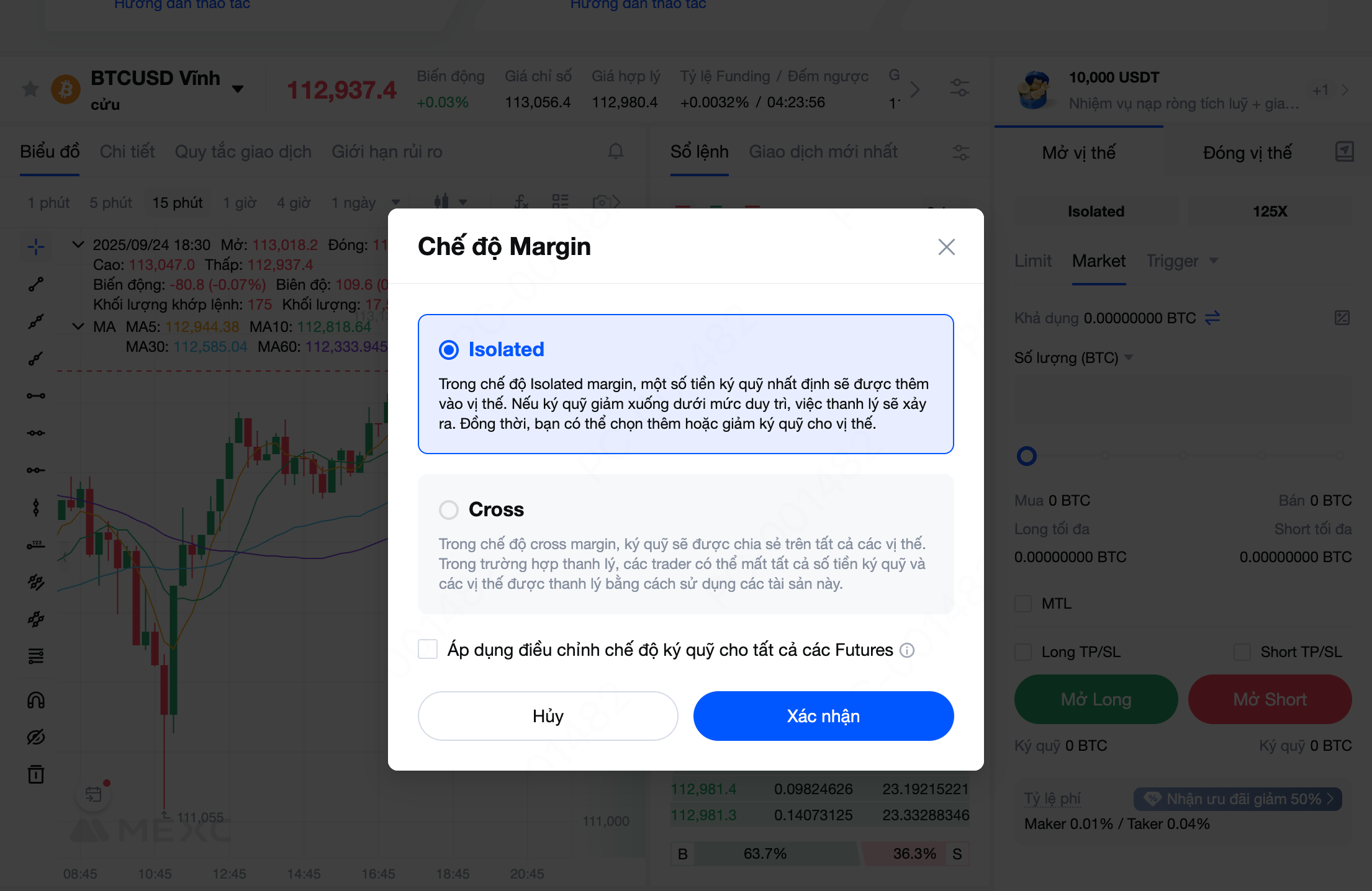 Về chế độ vị thế và chế độ ký quỹ, MEXC Coin-M Futures hoạt động tương tự như USDT-M Futures, hỗ trợ cả Chế độ phòng hộ và Chế độ một chiều, cũng như Cross margin và Isolated margin.