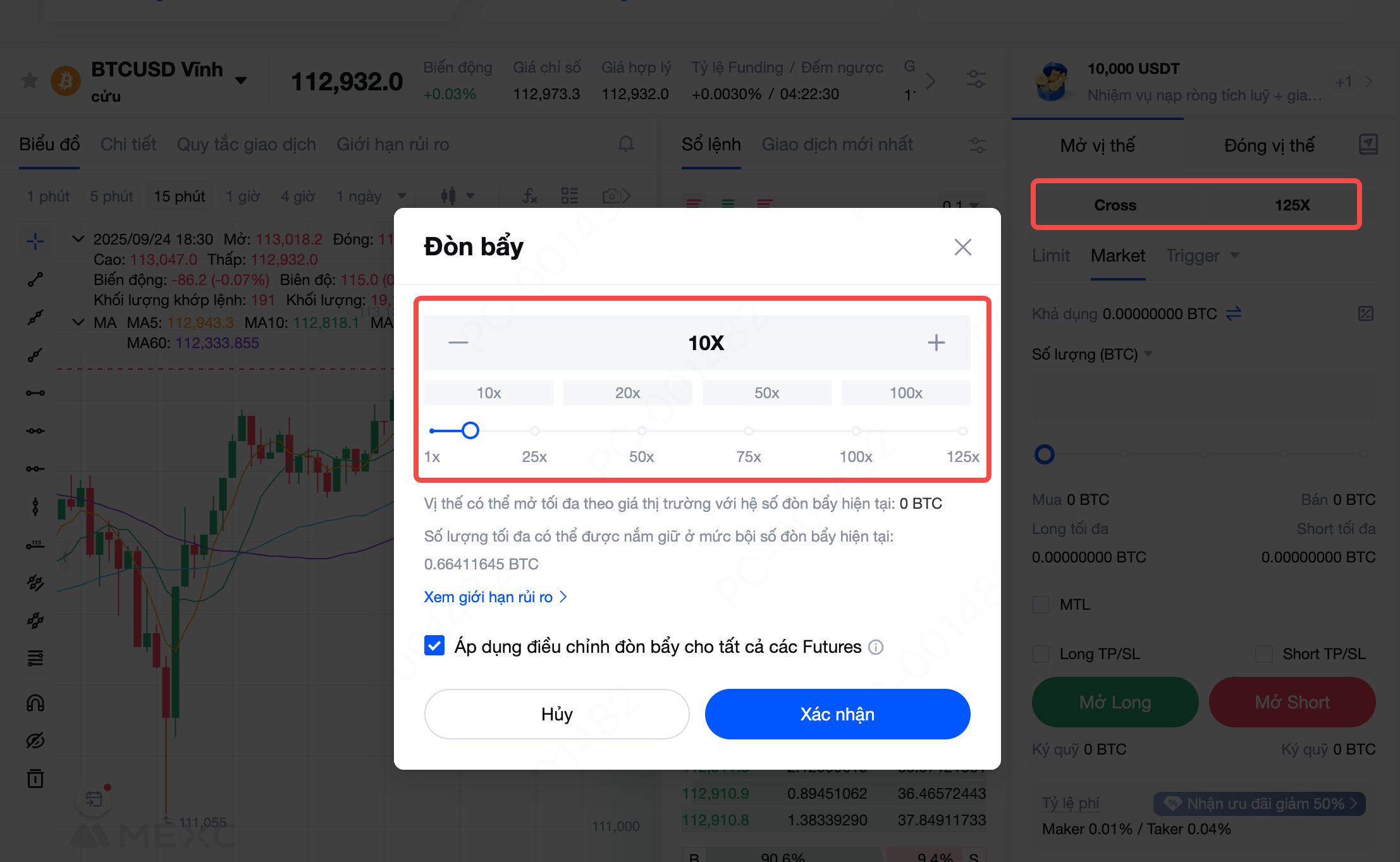 Khác với MEXC USDT-M Futures có thể có mức đòn bẩy khác nhau tùy theo từng cặp, cả BTCUSD Futures Vĩnh cửu và ETHUSD Futures Vĩnh cửu đều hỗ trợ đòn bẩy từ 1x đến 125x.