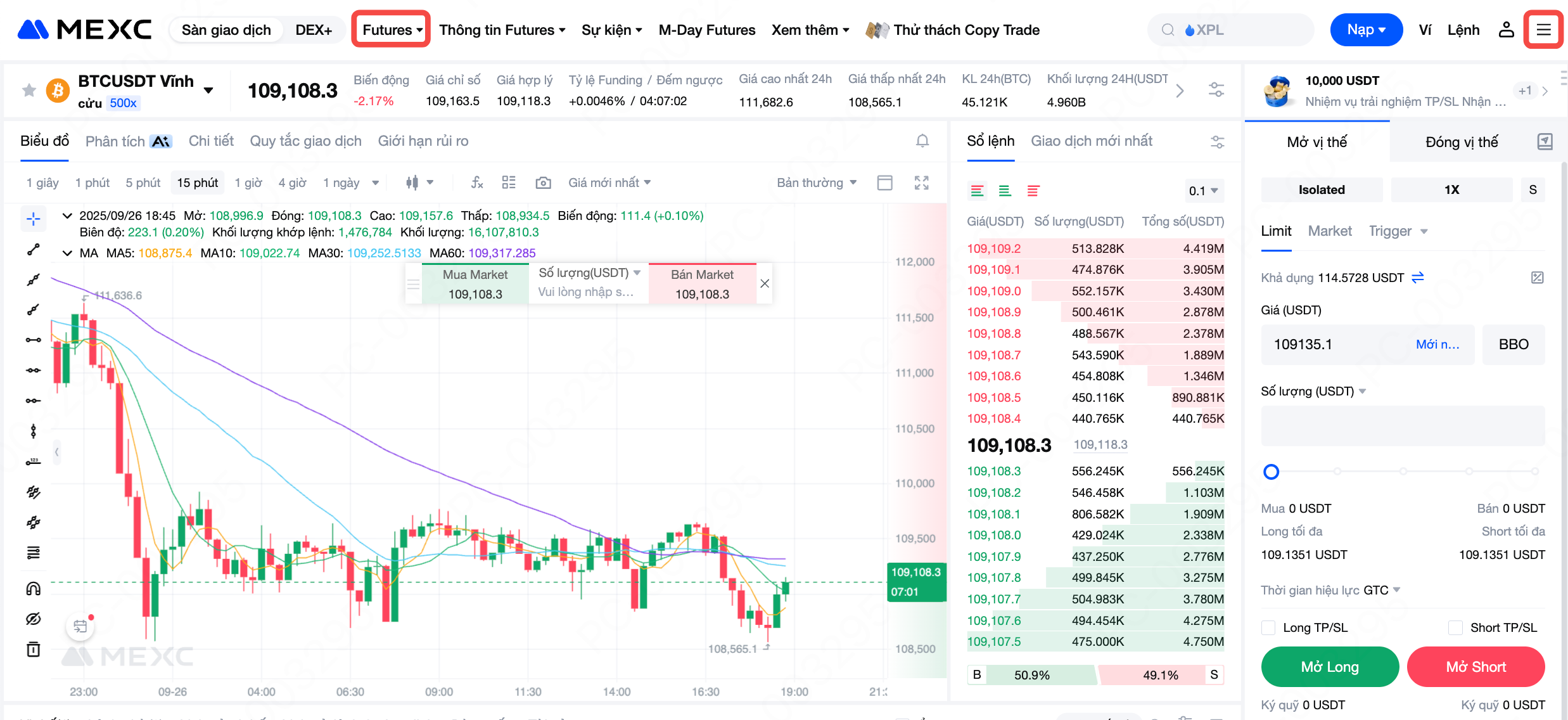 Đăng nhập vào trang web MEXC và chọn USDT-M Futures trong mục Futures ở thanh điều hướng trên cùng để vào trang giao dịch. Nhấn nút cài đặt ở góc trên bên phải của trang.