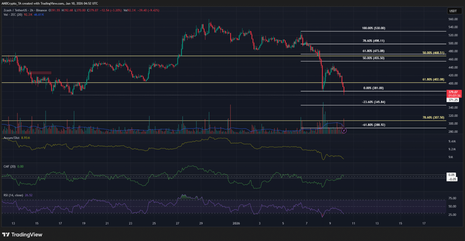 Tại thời điểm viết bài, ZEC đang chịu áp lực lớn khi đáy cục bộ tại 381 USD liên tục bị thử thách và đứng trước nguy cơ bị xuyên thủng. Trong bối cảnh đó, mốc 371 USD – vùng hỗ trợ quan trọng suốt tháng vừa qua – trở thành ngưỡng then chốt. Một khi giá phá vỡ xuống dưới mức này, kịch bản giảm sâu hơn sẽ được kích hoạt, buộc trader cân nhắc chiến lược bán, với các mục tiêu tiếp theo lần lượt nằm tại 345 USD và vùng hỗ trợ 307–288 USD.