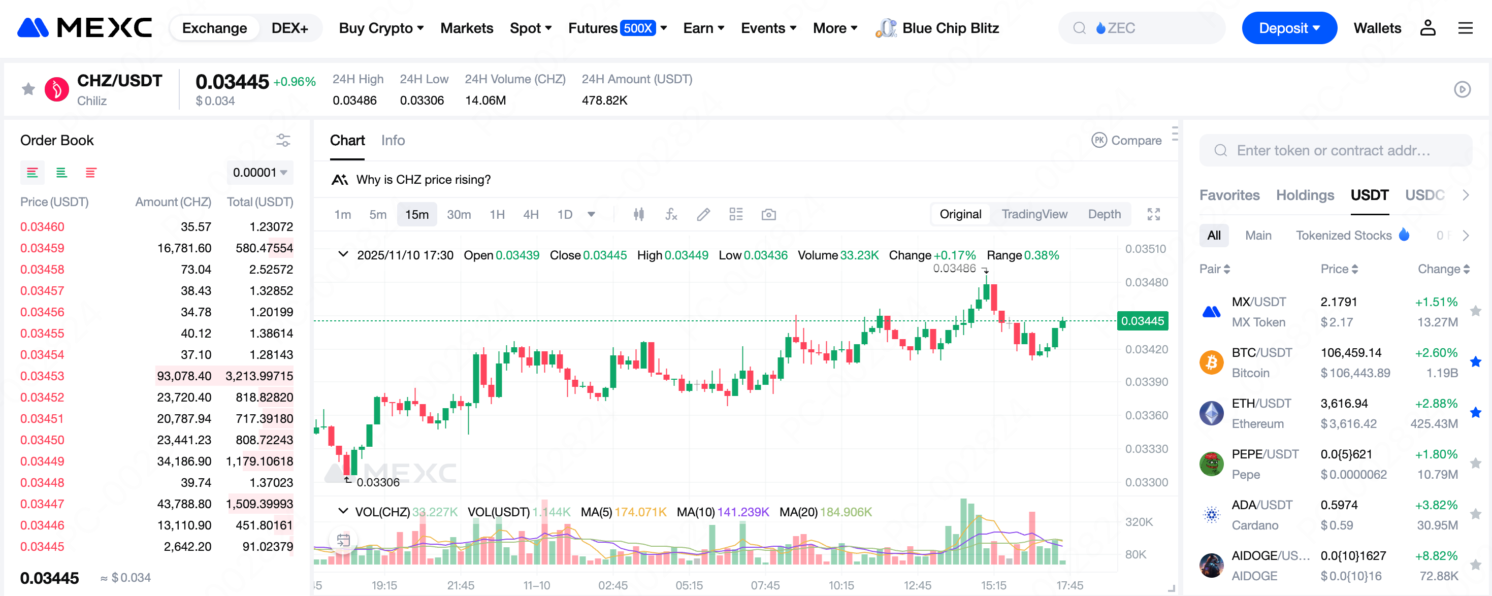 目前,CHZ 代币已在 MEXC 上线现货和合约交易,您可以在 MEXC 以超低费率进行代币交易。