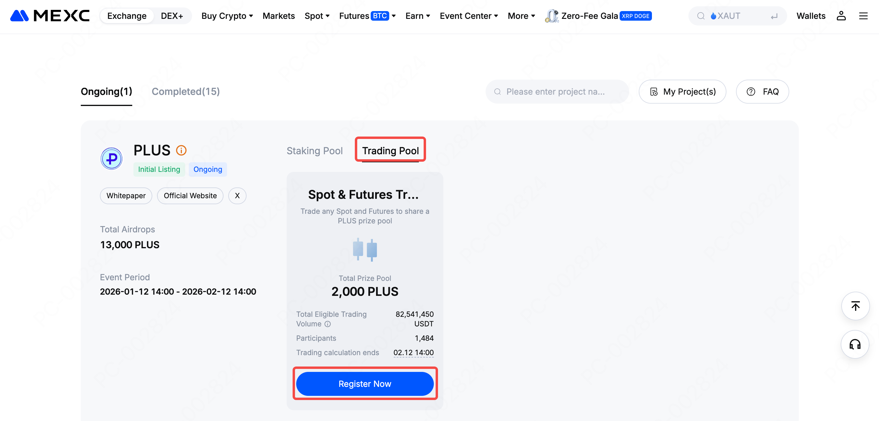 Launchpool 活动页面,选择正在进行中的 Launchpool 活动中,选择您想要参与的项目,在交易池中点击【报名参与】。