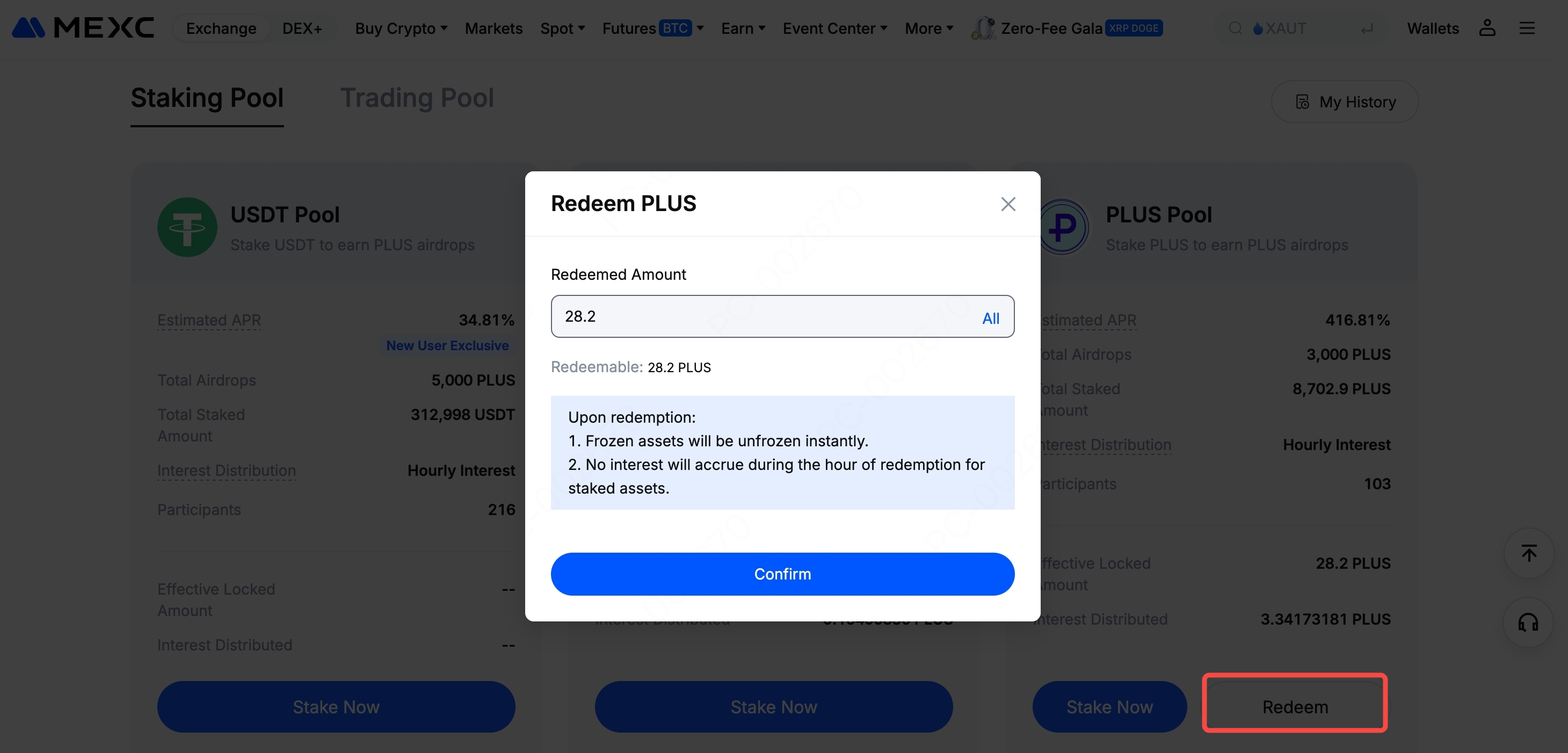 如果您想要在质押结束前赎回已经质押的代币,前往参与中的活动质押池页面,点击【赎回】即可。赎回后,代币将立即转至您的现货账户。