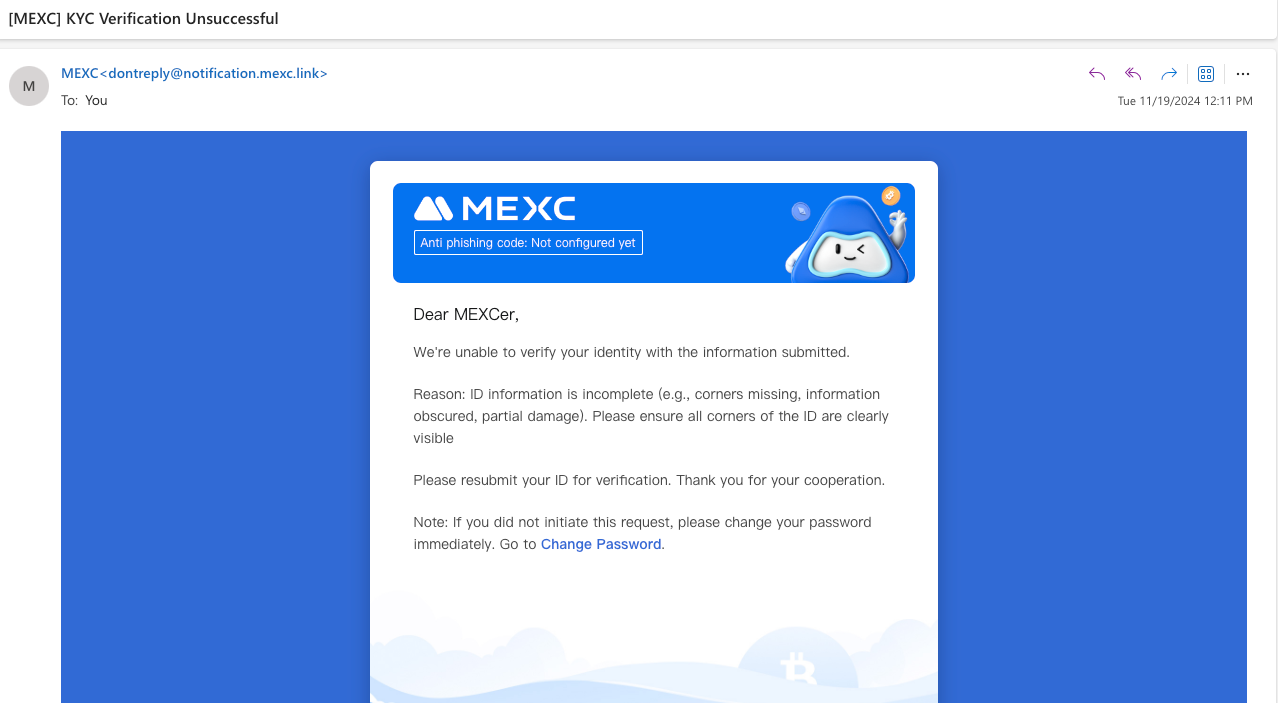 当您的个人身份认证提交后,MEXC 将会通过电子邮件发送个人身份认证结果。 您可以通过注册 MEXC 账户的电子邮箱中查看审核未通过的原因。