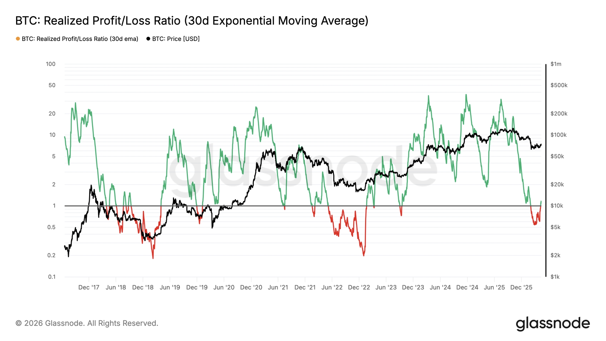 價格走勢逐漸讓位於資金流動,交易所流入量飆升至每小時 11,000 BTC,創下自 12 月以來新高。Glassnode 數據顯示,市場正轉向「獲利了結區」。已實現利潤逼近每日 5 億美元,其中超過 40% 的流入由大型機構主導。這意味著市場正積極進行獲利了結,若 74,000 美元失守,短期內可能出現動能耗盡的風險。