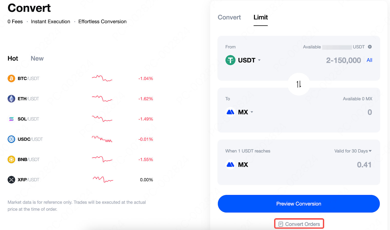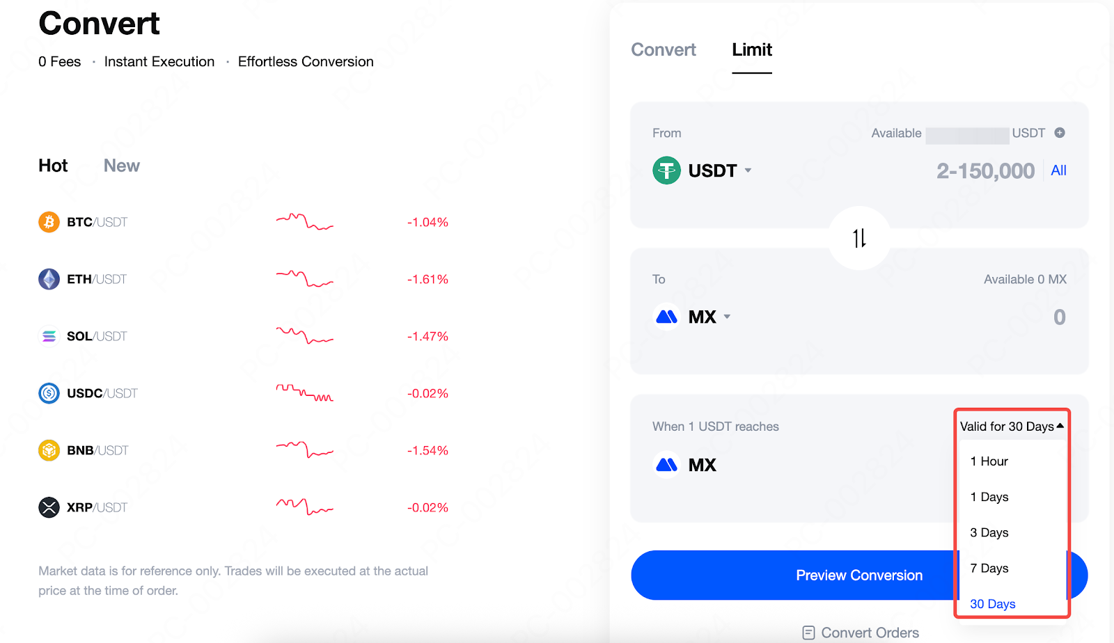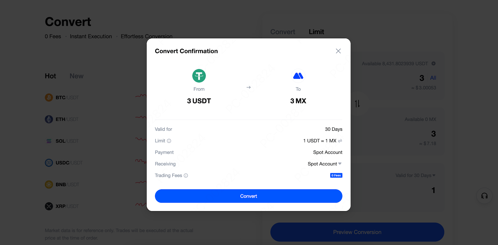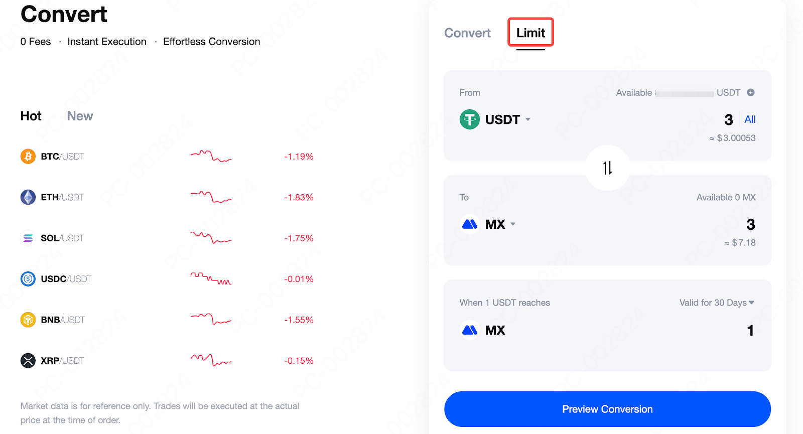 第 2 步:我們以使用 USDT 兌換成 MX 為例進行示範。在閃兌限價頁面,輸入您想要的目標價格,例如使用 3 USDT 兌換成 3 MX。