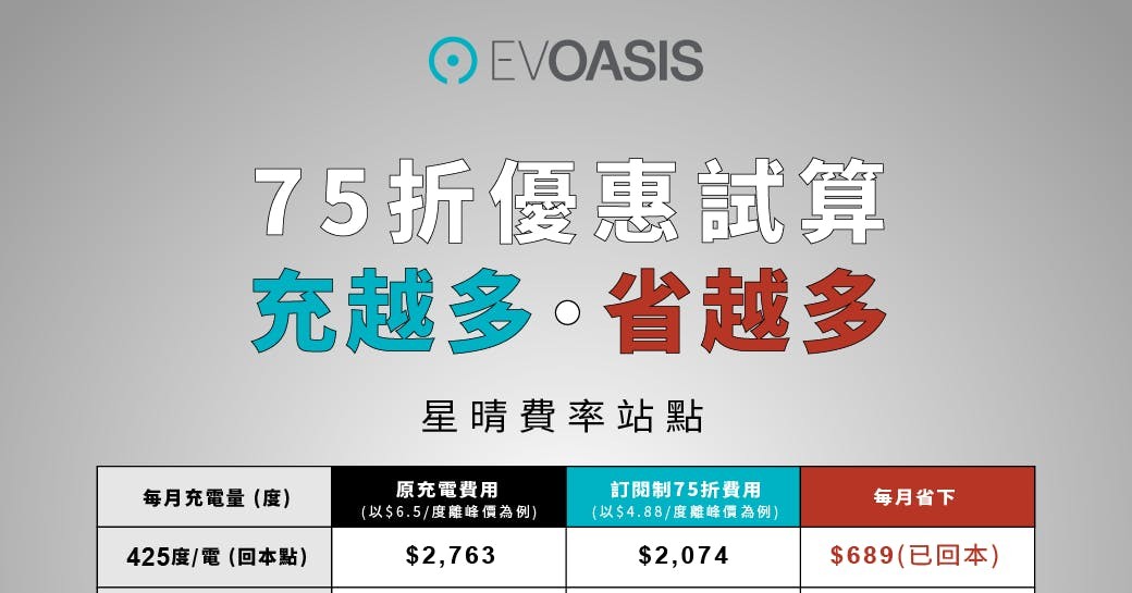 EVOASIS 今(5)日宣布推出全新訂閱方案「月付 688 元,充電 75 折」,以固定月費搭配全台 DC 快充站點折扣,明確瞄準職業駕駛、營業用車與高里程車主等高頻充電族群。官方強調,離峰時段折扣後每度電最低約落在 4.88 元,可明顯降低電動車營運成本,並進一步提升市面快充費率透明度與彈性。