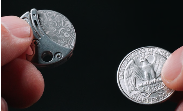這款 Tiniest Gear Coin 小刀在摺疊狀態下直徑約一英寸(2.54cm),跟一枚25美分硬幣差不多大。攤開後則露出短小刀刃,刀鋒長度約16mm,日幣拆包裹、割開紙箱膠帶或修剪需求很夠用。