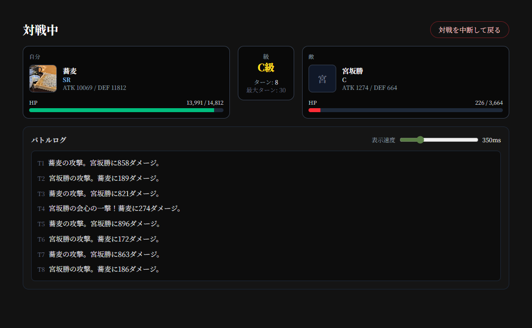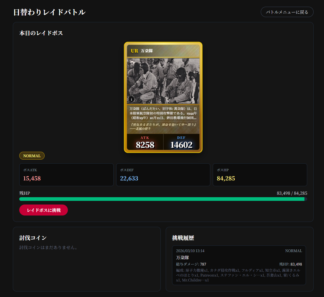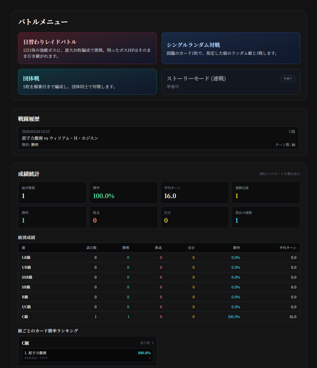 除圖鑑之外,網頁還有個戰鬥條目,並分為4種對戰類型,其中3種現在已經可以玩。首先是每日對戰,每天會輪替出現1張超強的卡牌,你得組成10張卡牌跟他對戰,輸了可以再換另外10張卡牌,直到你卡牌全都用光。