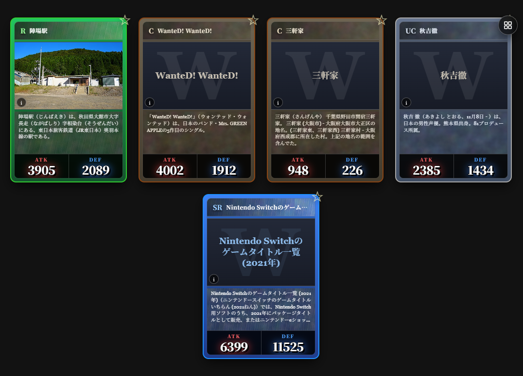 寶可夢、魔法風雲會、遊戲王加起來都沒這次的卡牌種類多,什麼卡包這麼誇張?那就是由日本開發者harusugi所開發的「維基百科抽卡(Wikipedia Gacha)」。簡單來說他將維基百科條目製作成各種稀有度的卡牌,並且依據頁面瀏覽量與內容長度分配攻擊力與防禦力,讓這674萬張卡牌真的能用來對戰。目前維基百科抽卡只要用瀏覽器,免註冊免登入就能免費抽卡玩,來試試看自己的手氣吧!