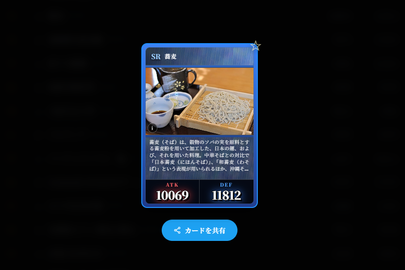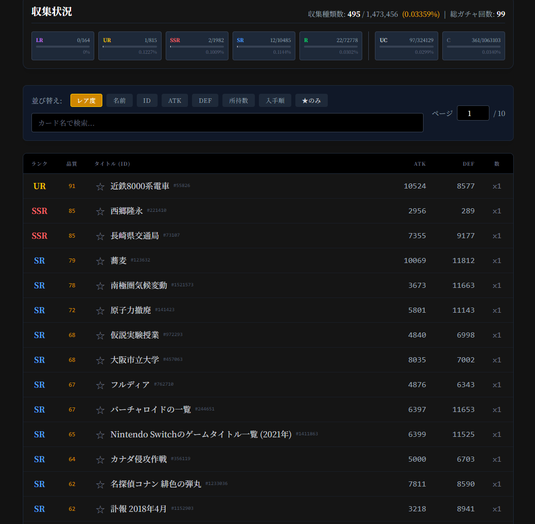 ▲卡包的獲取方式很簡單,每分鐘會獲得1包,看數秒廣告可以拿10包。還有每10包的保底機制,至少能獲得1張SR卡牌。▲黃金色保底包可開出至少1張SR卡,像是這就抽到任天堂Switch的相關卡牌。▲抽到的卡牌可在圖鑑中查詢,同樣的卡牌可重複抽,但幾百萬張卡要抽到重複的應該也很難。▲卡牌有多種等級代表其稀有度,通常稀有度高的卡排都有精美的圖案。▲單以對戰強度來說,稀有度高不代表卡牌強,像是SR的蕎麥就比不少高階卡還強。▲點選網頁右上角的獎盃可開啟成就,看看你完成了那些成就。